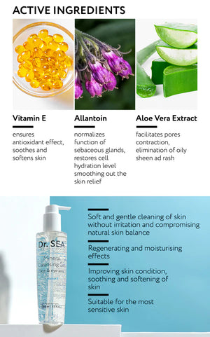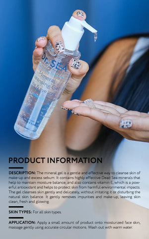 The mineral gel is a gentle and effective way to cleanse skin of make-up and excess sebum. It contains highly effective Dead Sea minerals that help to maintain moisture balance, and also contains vitamin E, which is a powerful antioxidant and helps to protect skin from harmful environmental impacts. The gel cleanses skin gently and delicately, without irritating it or disturbing the natural skin balance. It gently removes impurities and make-up, leaving skin clean, fresh and glowing. It is suitable for daily application for all skin types, including the sensitive eye area.